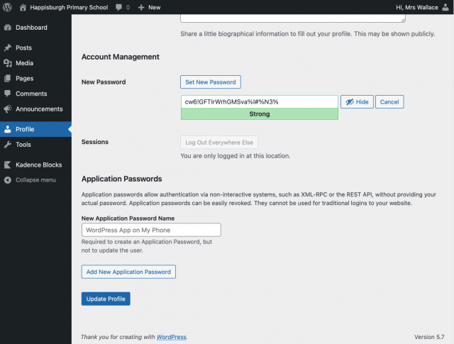 Accept the generated password or more likely type in your own. Click Update Profile to save.