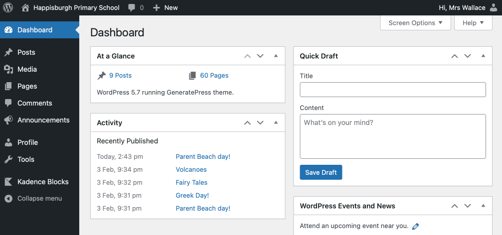 The Dashboard is not terribly exciting but does give you quick access from the left hand panel to your blog Posts, Media uploads (photos, images, documents etc) and any Pages you can edit. It also has a link back to your website, just click on the websites title in the top admin bar.
