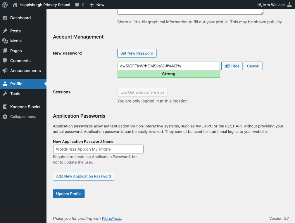 Accept the generated password or more likely type in your own. Click Update Profile to save.